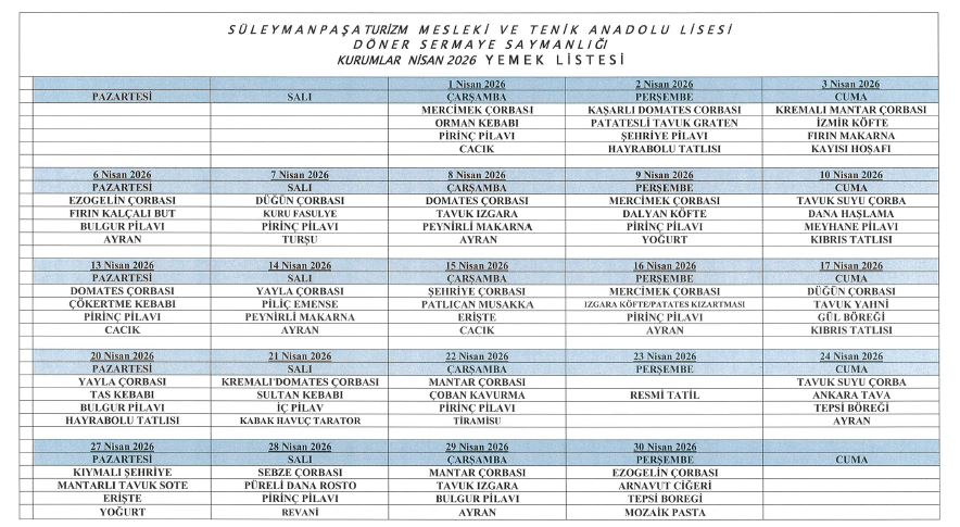 YEMEK LİSTESİ (NİSAN 2026)